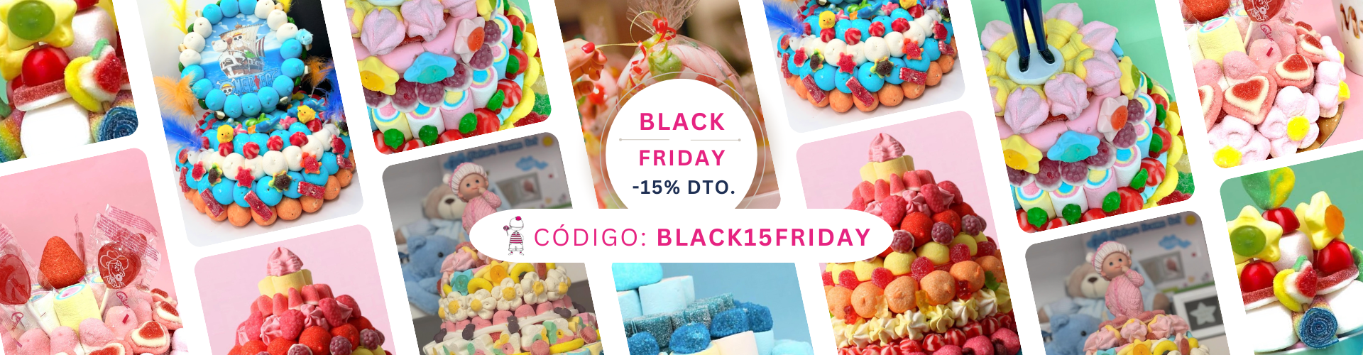 Tienda online de tartas de chuches y de otros productos de golosinas, para fiestas y ocasiones especiales, como ramos y conos de chuches, velas, tarros y tazas, etc.