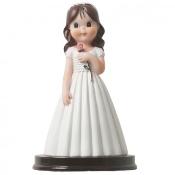 Muñeca de Comunión niña para tarta, con vestodo blanco largo y sujetando una rosa.