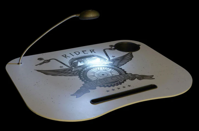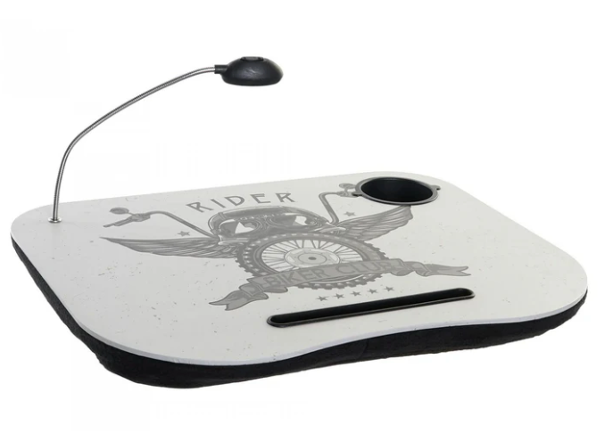 Bandeja Ordenador Led Rider de Item. Práctica bandeja de PVC con unas medidas de 48X38X7 cm, que trae incorporada una luz flexible de led alimentada por pilas. Muy útil y ergonómica tanto para usarla para comer, ya que trae incorporada un hueco para el vaso; escribir con hueco para el lápiz o boli, como para usar el portátil, tablet y poderse apoyar sobre las piernas, gracias a su acolchado que nos aisla del calor y nos proporciona comodidad. Muy fácil de limpiar y util para usar también en el sofá, cama... Viene perfectamente estuchada con su caja de presentación, ideal para regalar