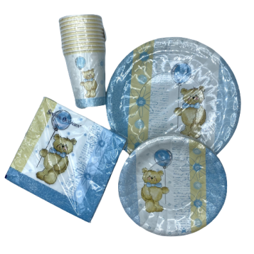 Que mejor manera de celebrarlo con este pack para decorar un día tan especial, y darle la bienvenida que se merece vuestro pequeño. Este conjunto se compone de 10 platos grandes, 10 platos pequeños, 20 servilletas y 10 vasos.