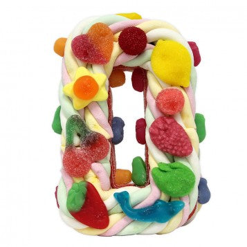 Número 0 realizado a base de deliciosas nubes de azucar y lenguas, con surtido de chuches a modo de detalle, que le dan un toque especial de color.