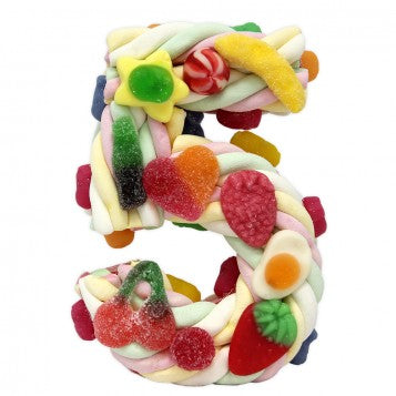 Número 5 realizado a base de deliciosas nubes de azucar y lenguas, con surtido de chuches a modo de detalle, que le dan un toque especial de color.