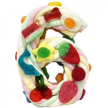 Número 6 realizado a base de deliciosas nubes de azucar y lenguas, con surtido de chuches a modo de detalle, que le dan un toque especial de color.