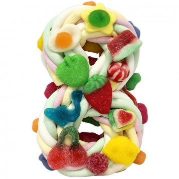 Número 8 realizado a base de deliciosas nubes de azucar y lenguas, con surtido de chuches a modo de detalle, que le dan un toque especial de color.