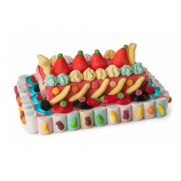 Esta tarta de chuches rectangular está formada por una base de nubes multicolor (dianas) y frutas variadas, lenguas sabor fresa, discos negros y rojos de pegadolsa, fresas, moras y delfines con perlitas de frutas variadas azucaradas y un segundo piso con lenguas de fresa, platanos merengues y fresones espumosos y colas.