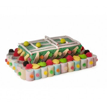 Si su deporte estrella es el tenis, seguro que le encanta que le regales esta tarta de chuches con forma de pista de tenis.