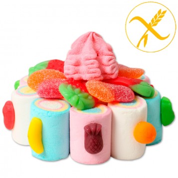 Esta pequeña tartaleta de chuches sin gluten para una persona cuenta con una base de nubes y con una nube roja como guinda del pastel.