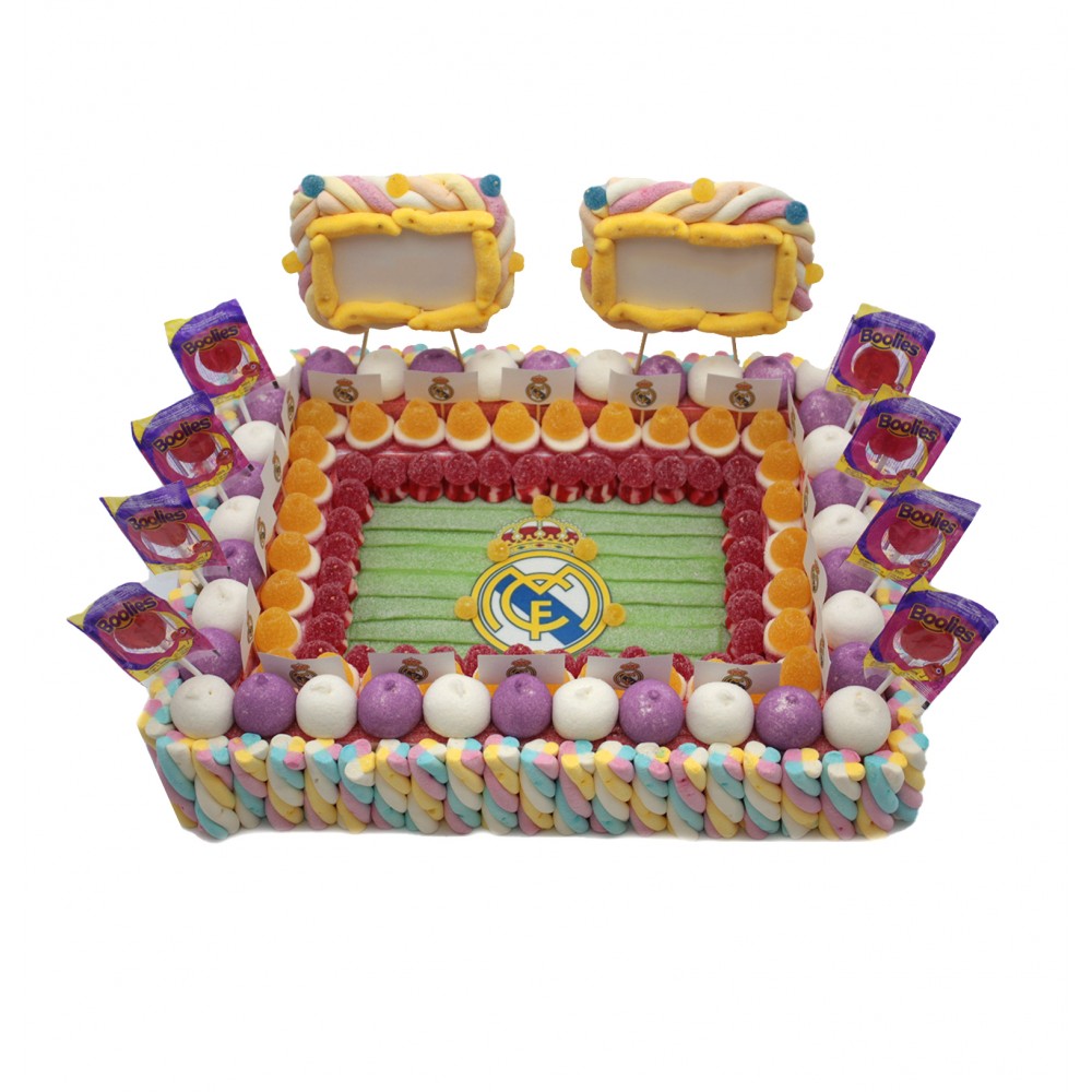 Casi 3 kilos de chuhes forman esta espectacular tarta super grande en forma de campo de futbol con gradas y marcadores. ¡No falta ningún detalle!