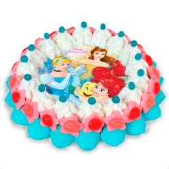 Tarta de chuches que sorprenderá a las más pequeñas, con tres de sus princesas Disney favoritas, juntas en esta entrañable oblea comestible.