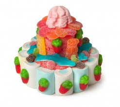 Con un peso de 300 gr. y una altura de 14x14 cm, esta tarta de chuches combina a la perfección golosinas de azúcar con otras más esponjosas para los que prefieren las clásicas nubes.