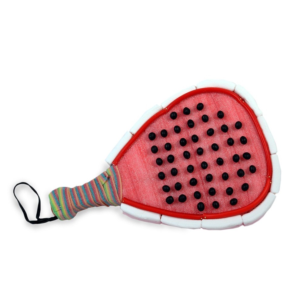 Si le apasiona jugar al pádel seguro que le dejas con la boca abierta con este regalo. Esta tarta de chuches de 490 gr. de peso y una altura de 37x24 cm. con forma de raqueta está hecha con nubes clásicas, regaliz rojo, lenguas de fresa y bolas de chocolate. El mejor premio después de un duro partido.