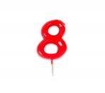 Vela roja número 8, con palillo de madera para clavarla en la tarta.